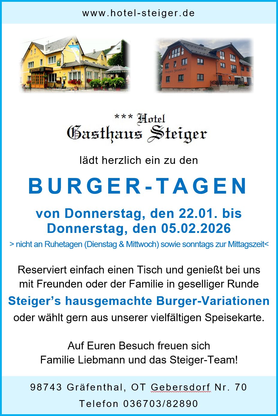 im Hotel Gasthaus Steiger laden wir Euch herzlich zu unseren Burger-Tagen ein.
