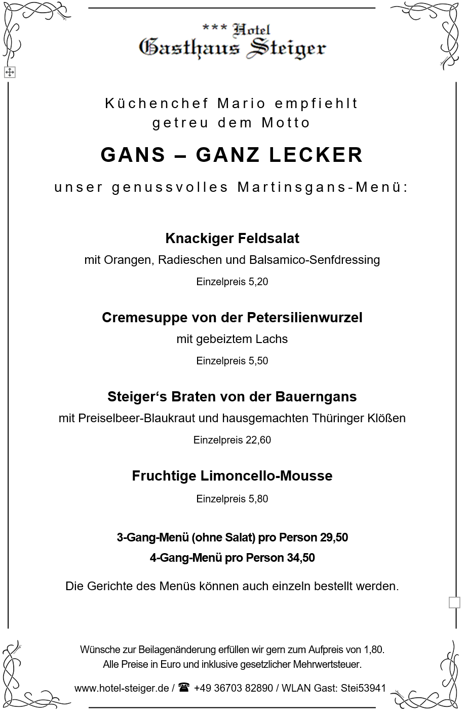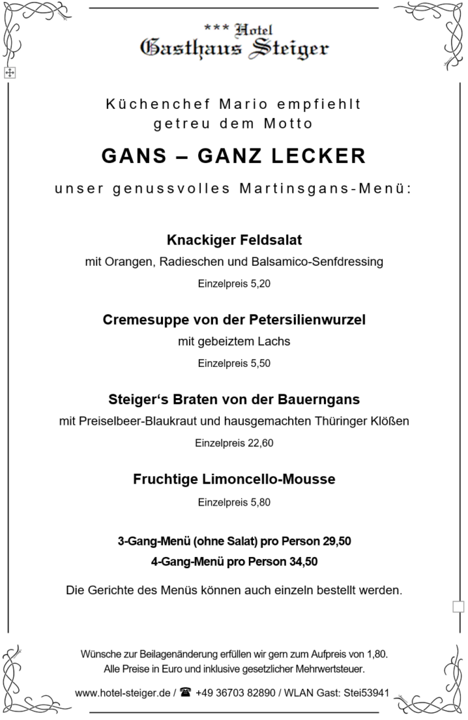 Wir freuen uns immer über Euren Besuch, doch zur Martinszeit lohnt es sich für Euch besonders: Beim Martinsgans-Essen (13.11.2025 bis 16.11.2025) verwöhnt das Steiger-Team seine Gäste mit hausgemachtem Gänsebraten, serviert mit Rotkraut, Thüringer Klößen und allem, was zu einem festlichen Genuss dazugehört. Ob mit Familie oder Freunden – hier schmeckt man die Liebe zum Detail und die regionale Kochtradition, für die das Haus bekannt ist.