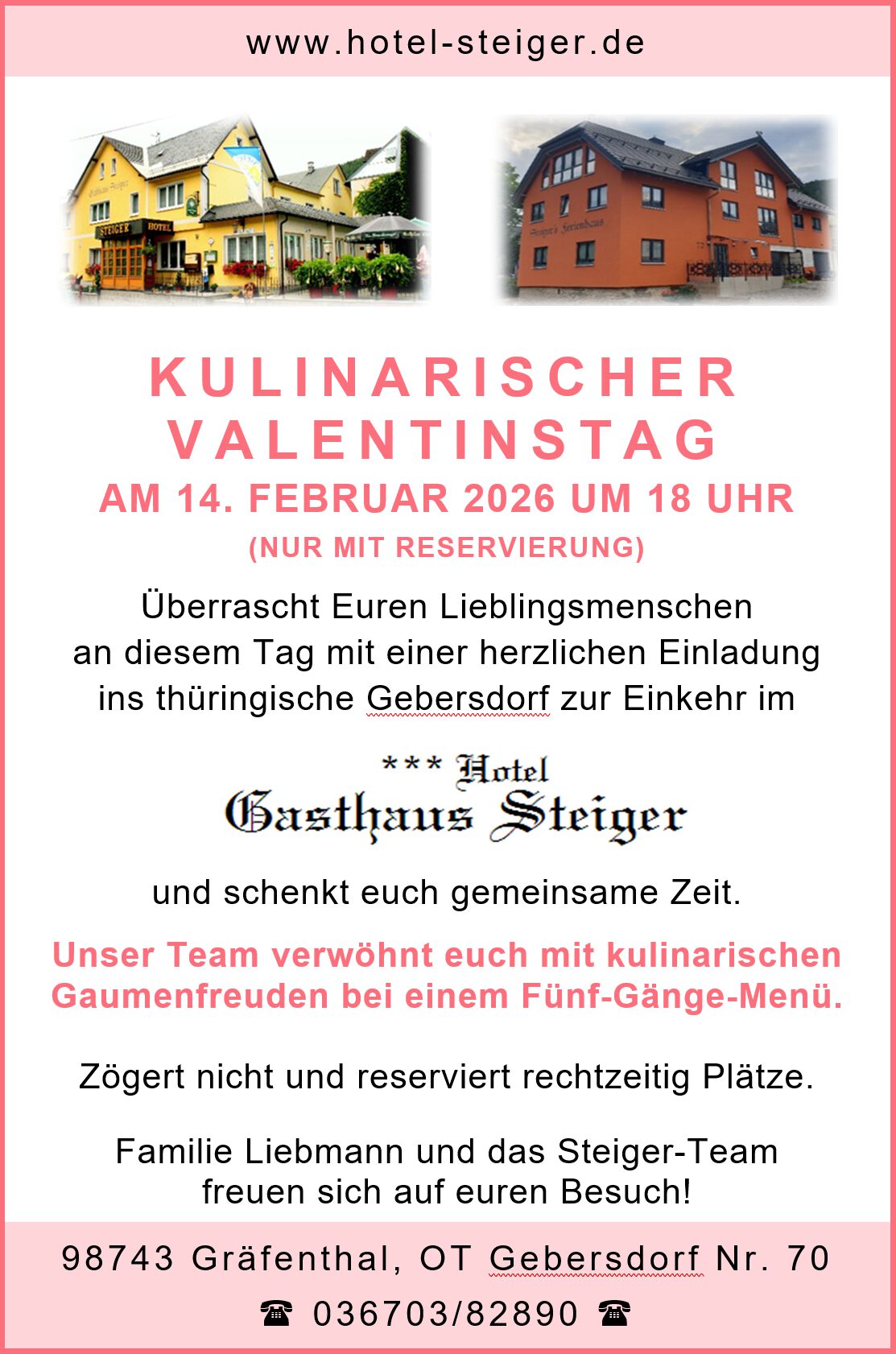 der kulinarische Valentinstag im Hotel Gasthaus Steiger ist eine schöne Gelegenheit, gemeinsame Zeit zu verschenken und den Abend in besonderer Atmosphäre zu genießen.