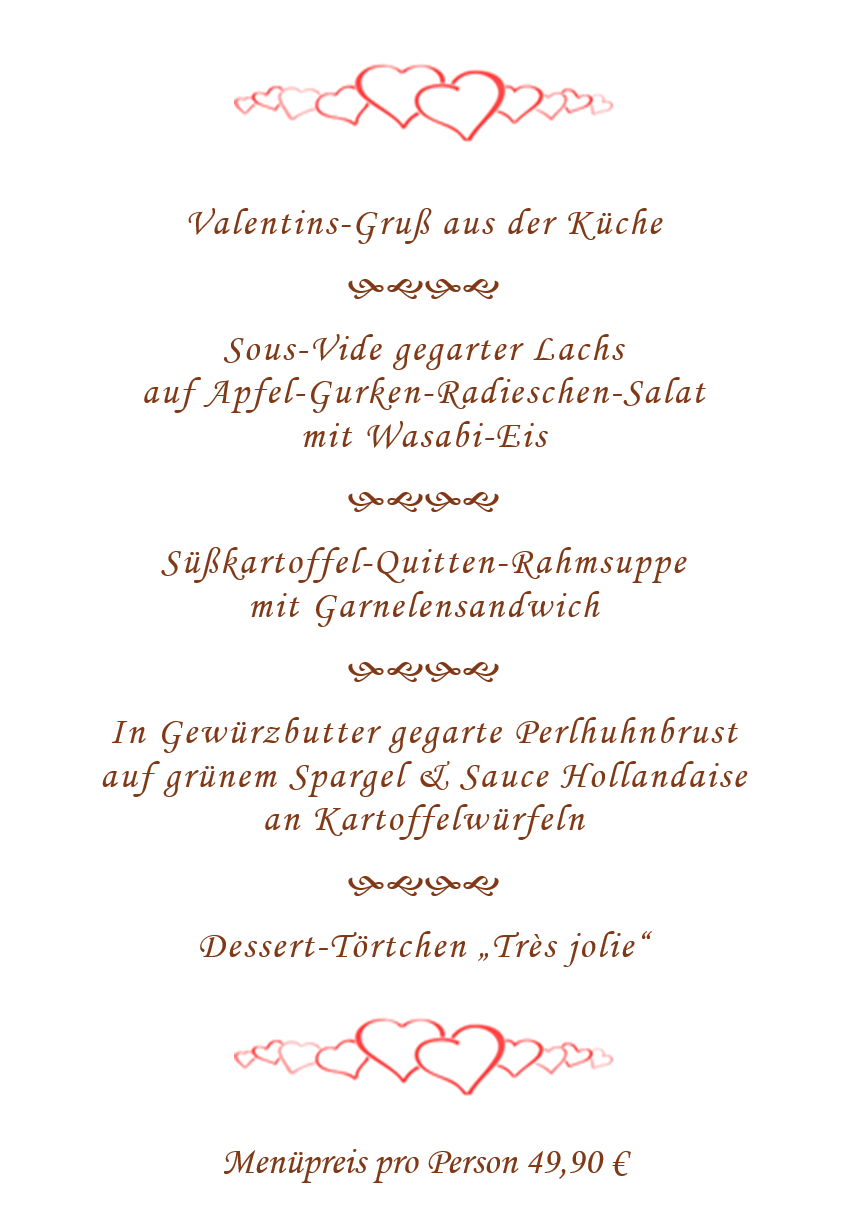 Freut Euch auf einen besonderen Valentins-Gruß aus der Küche und einen genussvollen Abend mit einem Fünf-Gänge-Menü, das mit Sorgfalt, Liebe zum Detail und feinen Aromen zusammengestellt wurde. Jeder Gang ist darauf ausgelegt, diesen Abend gemeinsam zu genießen und bewusst Zeit miteinander zu verbringen.